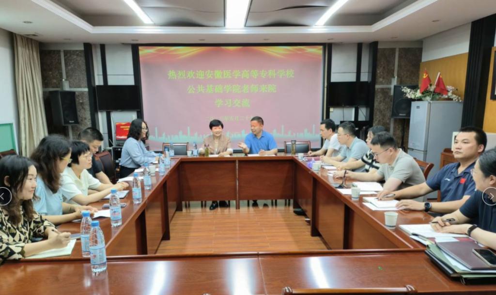 为深入开展学习贯彻习近平新时代中国特色社会主义思想主题教育,牢牢把握“学思想、强党性、重实践、建新功”的总要求,学习兄弟院校在办学管理过程中的先进经验和重要举措。5月29日上午,公共基础学院负责人刘志梅率队赴安徽医科大学学习调研,与该校人文医学学院骆广东院长、各系部负责同志等举行交流座谈会。副院长陈艳、教研室主任汪光胜、王萱、贾小青、胡明以及教学秘书张晓参加调研。